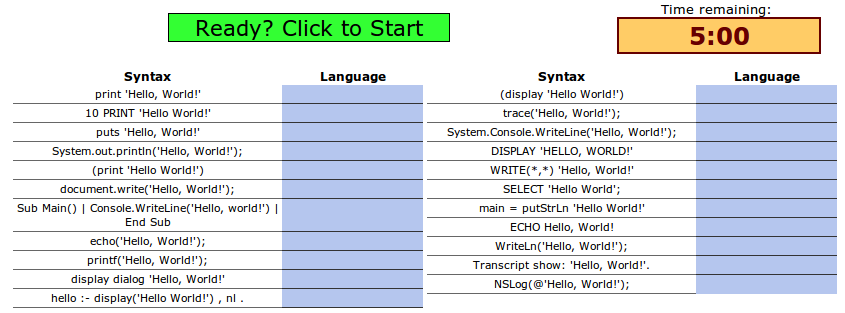 - tuxotron En este enlace tienes 22 'Hello world' sentencias escritas en 22 lenguajes de programación distintos. Una vez hagas click en el botón 'Ready? Click to start' tienes 5 minutos para escribir los lenguajes que identifiques.