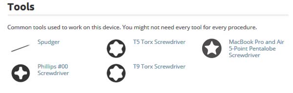 En cada apartado te muestra además las herramientas necesarias para proceder a la reparación, por ejemplo esto es lo necesario para manipular un Mac Book Air 13" (quizás uno de los dispositivos más complicados de abrir):