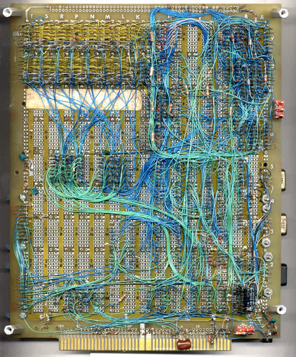 (Prototipo de Mac cableado usando wired-wrapping. Parte trasera. Imágen: Digibarn)